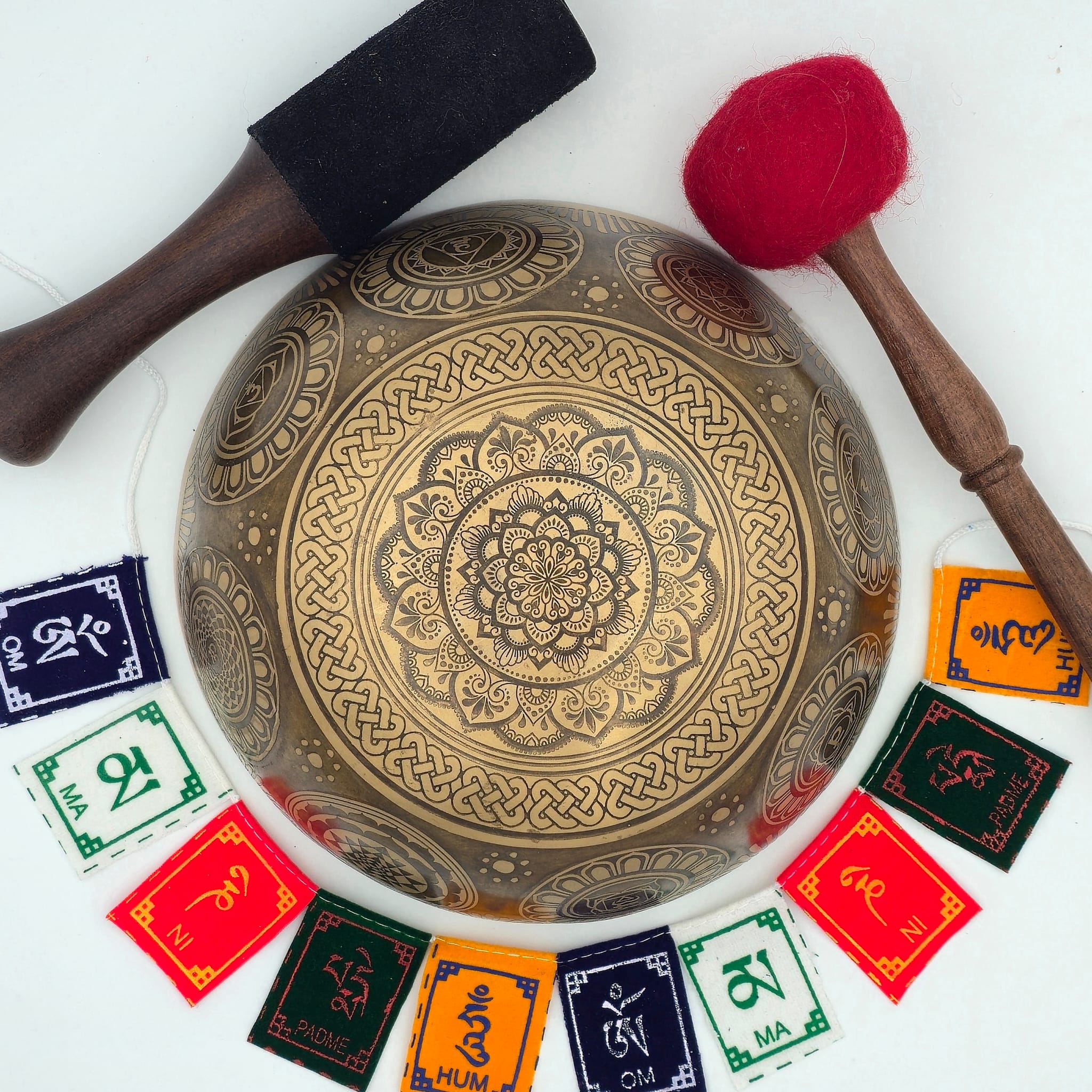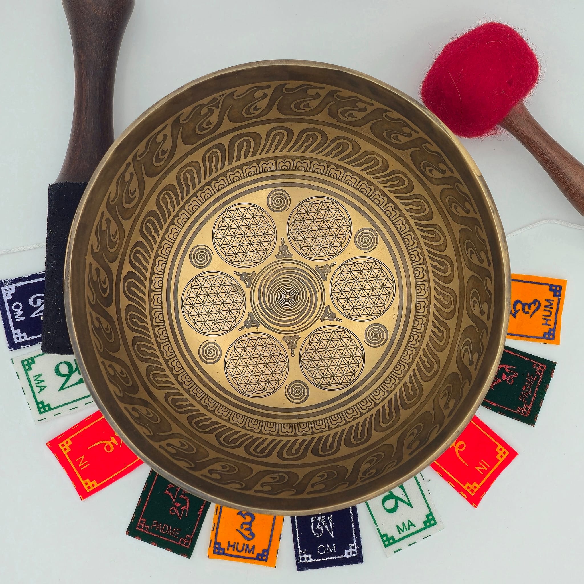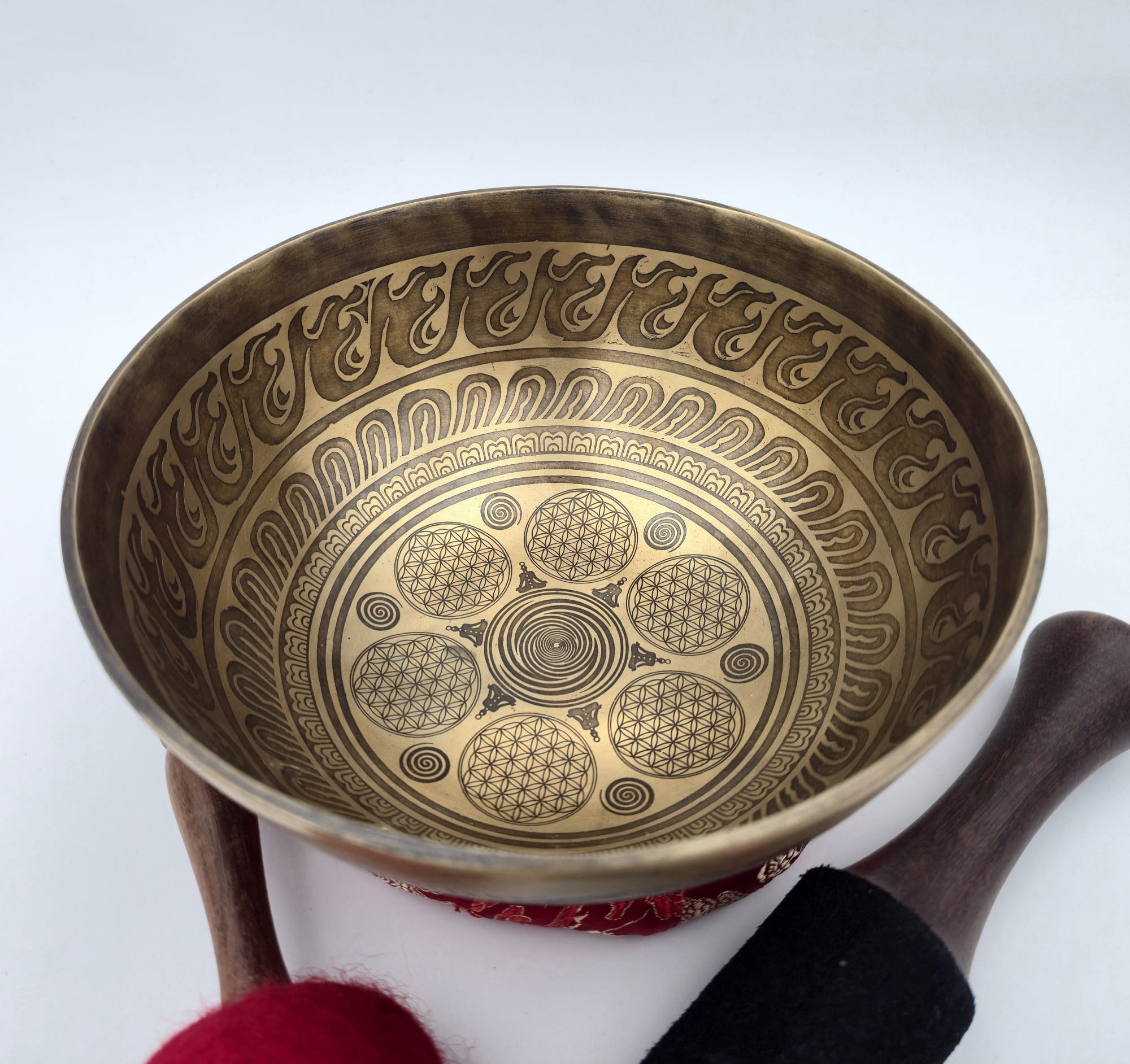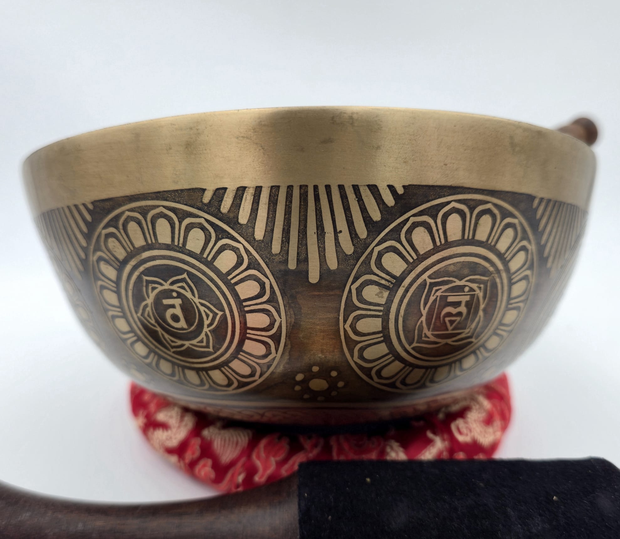 Les gravures apportent également une présence visuelle harmonieuse à cette pièce, tout en conservant l’équilibre sonore propre aux bols chantants travaillés avec soin.