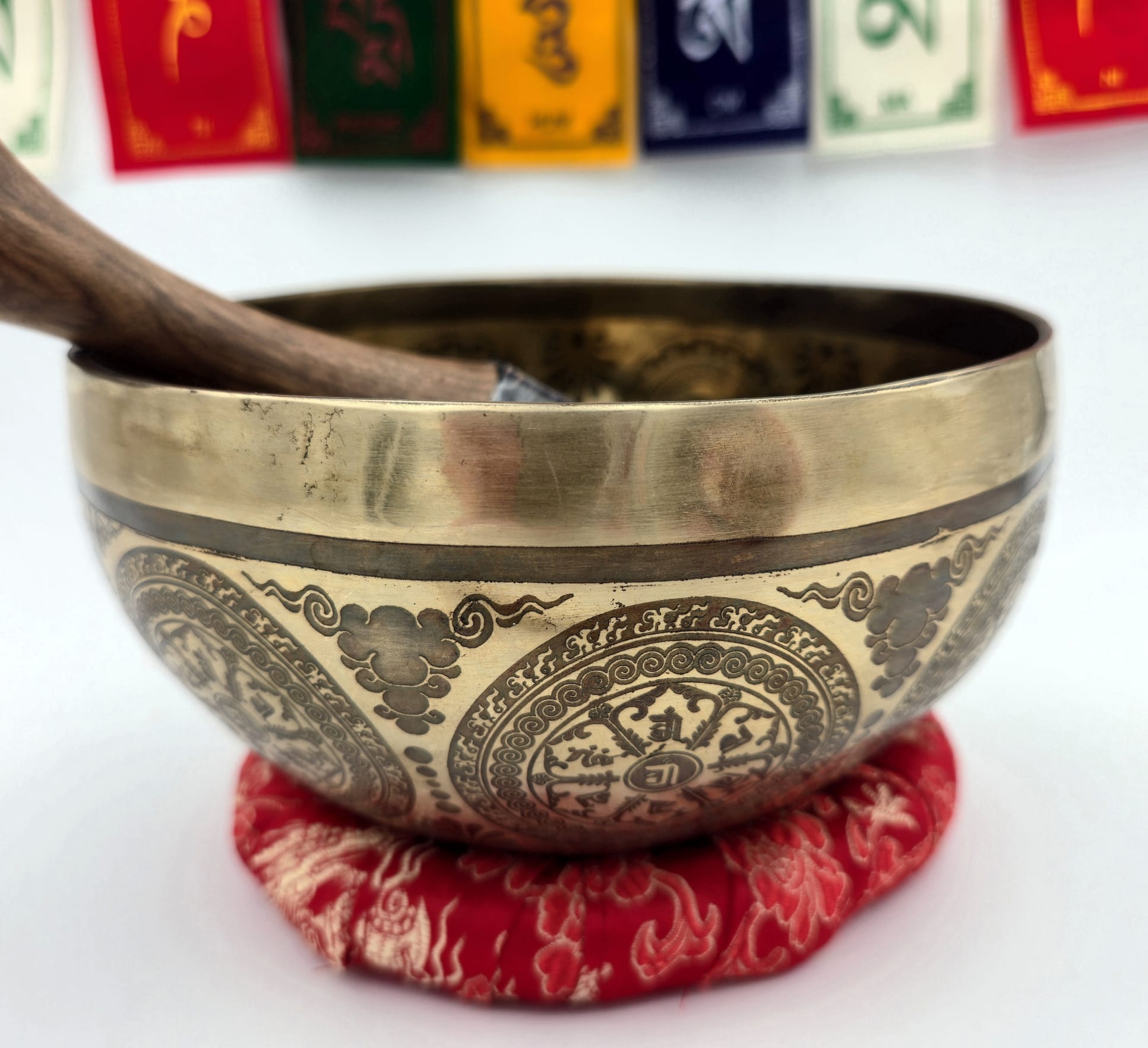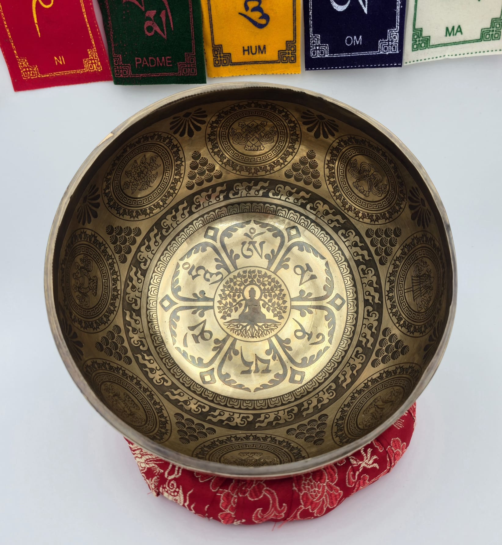 Le travail de gravure intègre les huit symboles auspicieux du bouddhisme ainsi que le mantra Om Mani Padme Hum, accompagnés d’un dragon tibétain finement représenté. Dans la tradition, le dragon symbolise la force, la protection et l’énergie en mouvement, renforçant la dimension visuelle et vibratoire du bol.