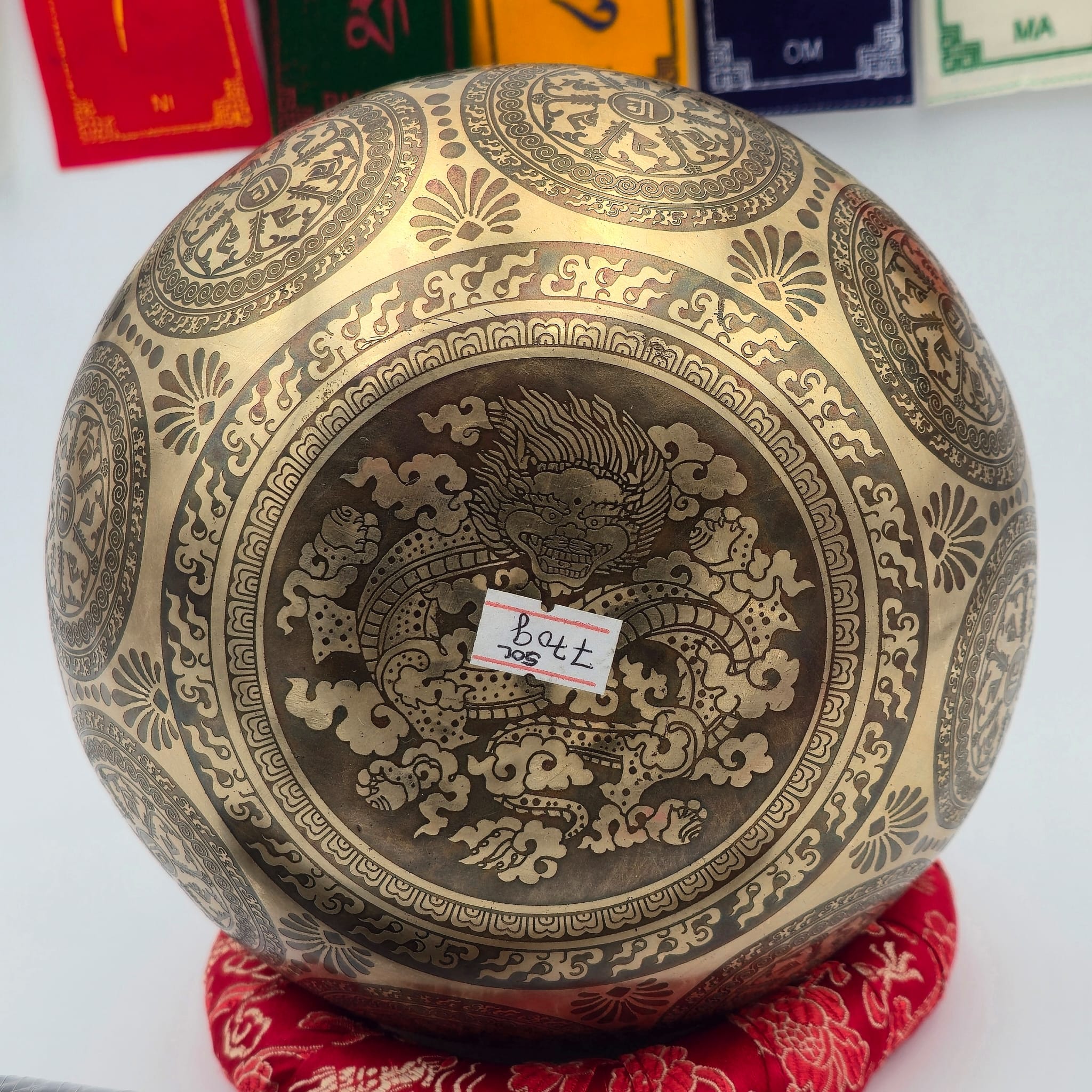 | Motifs | Huit symboles auspicieux + dragon tibétain + Om Mani Padme Hum |
