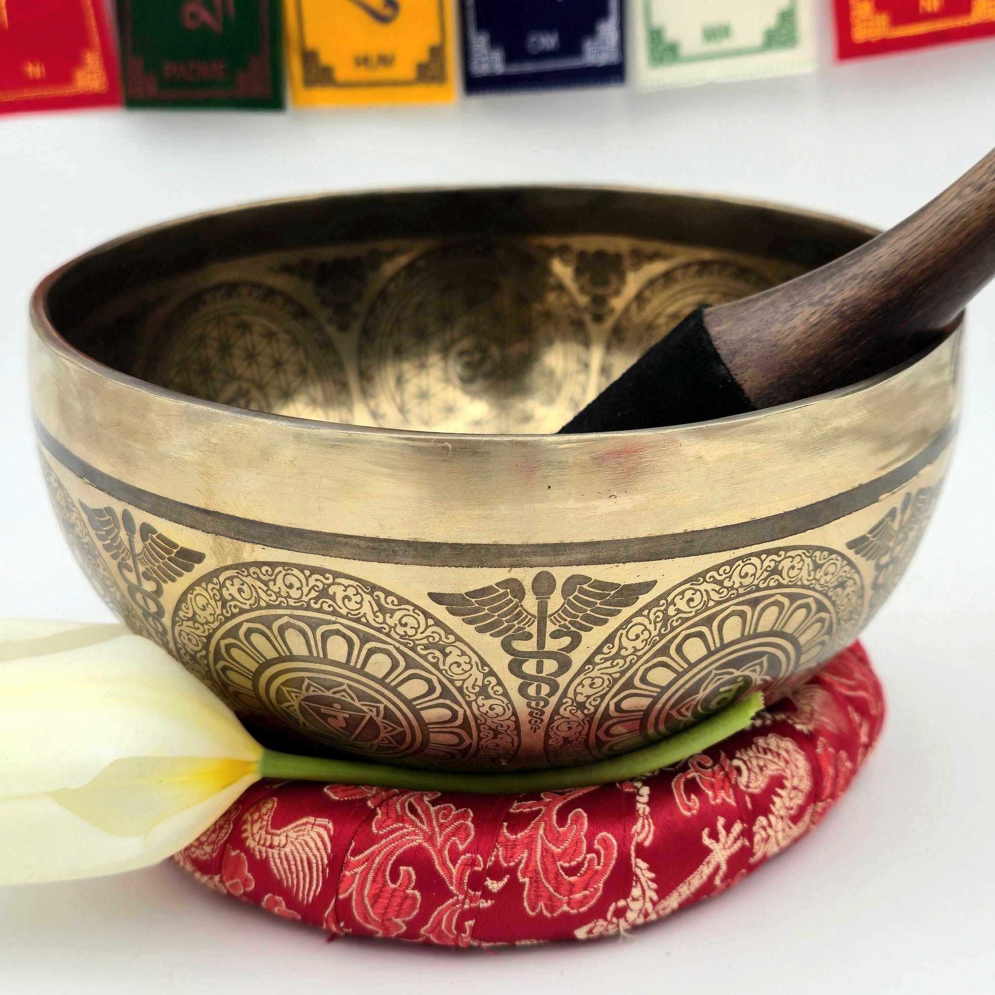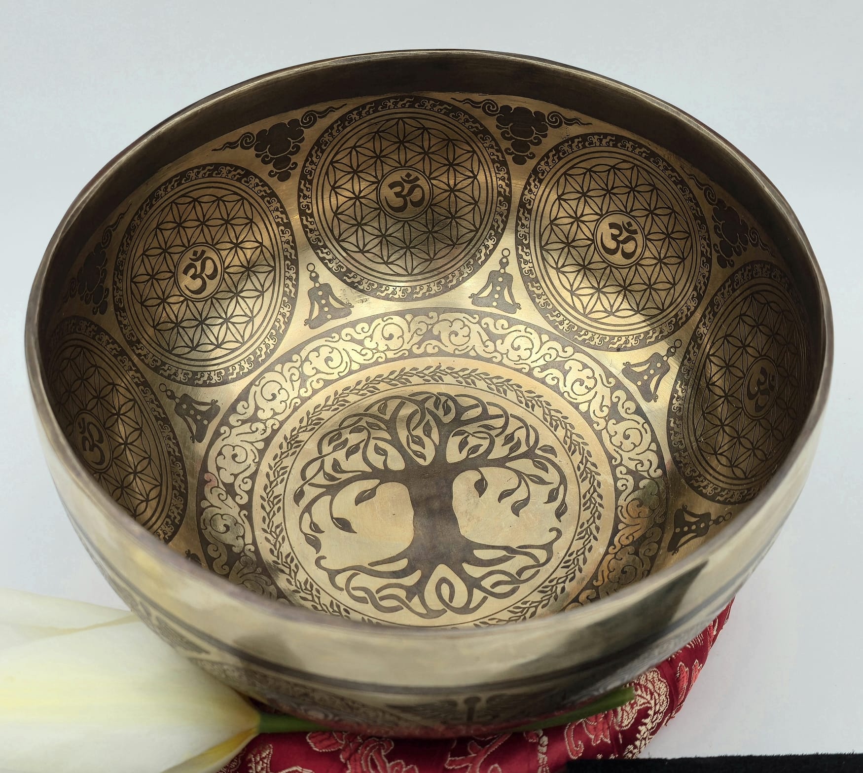 Le travail de gravure, finement réalisé, intègre des symboles inspirés de traditions sacrées tels que l’arbre de vie, la fleur de vie, le symbole Om, ainsi que des motifs associés à la guérison comme le caducée. Ces éléments apportent une dimension visuelle forte, en lien avec une approche vibratoire du son.