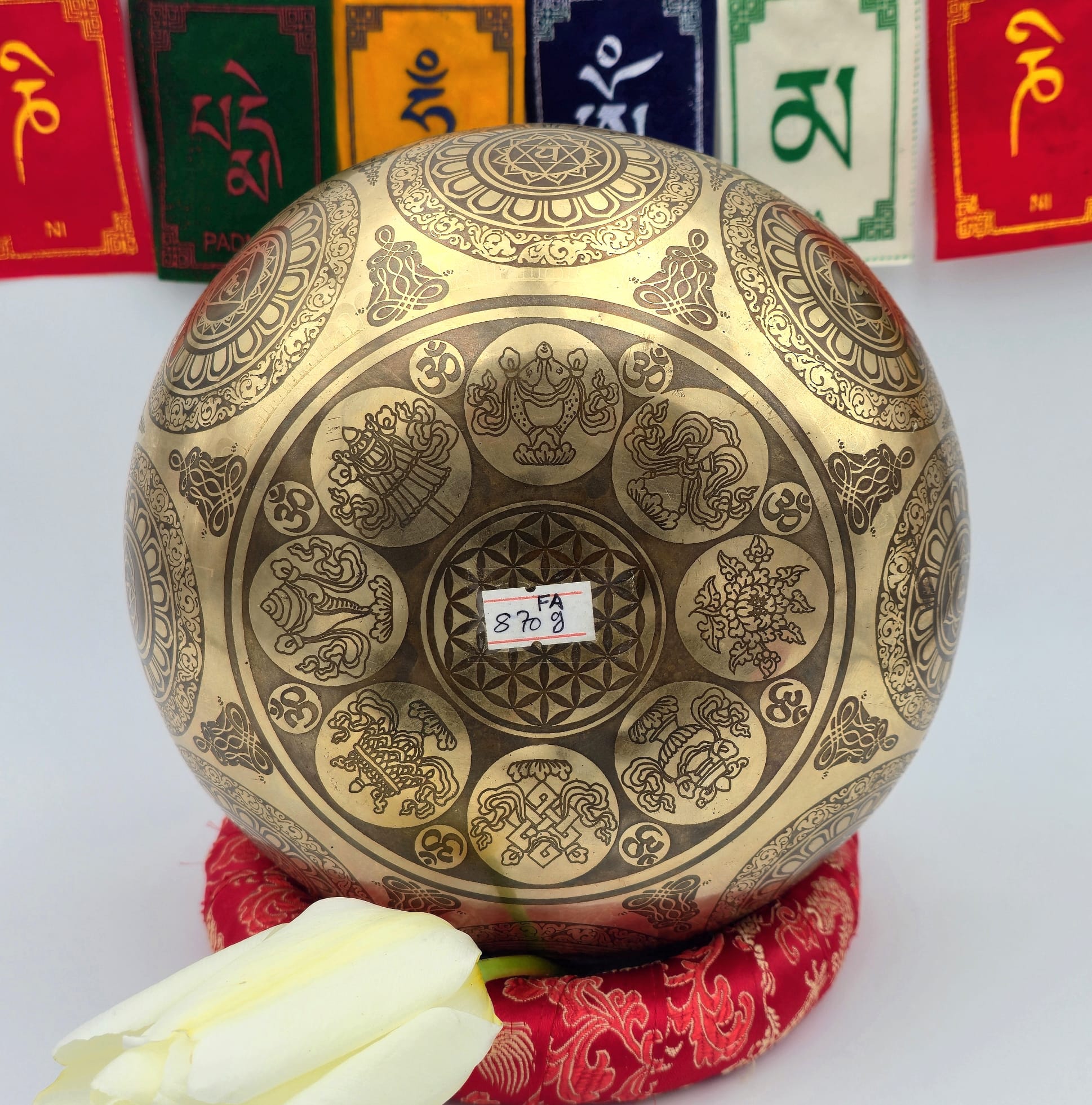 Ce bol chantant tibétain gravé 7 métaux de 870 g en tonalité de Fa est une pièce remarquable, à la fois équilibrée et très agréable à jouer.